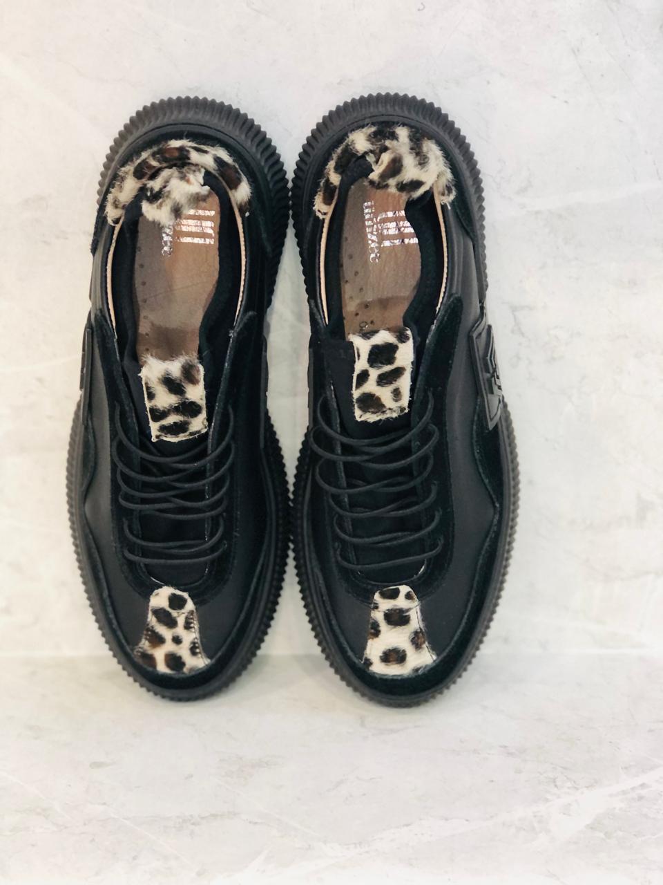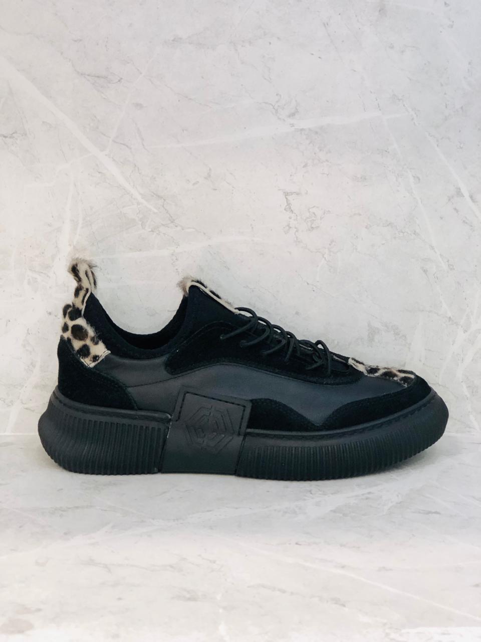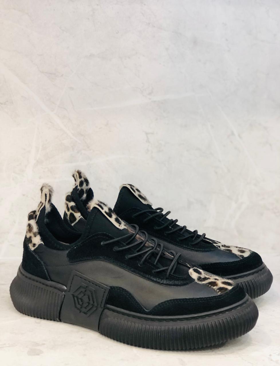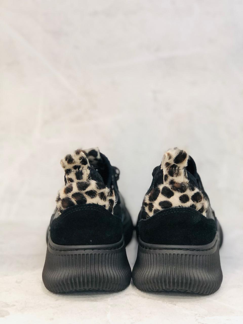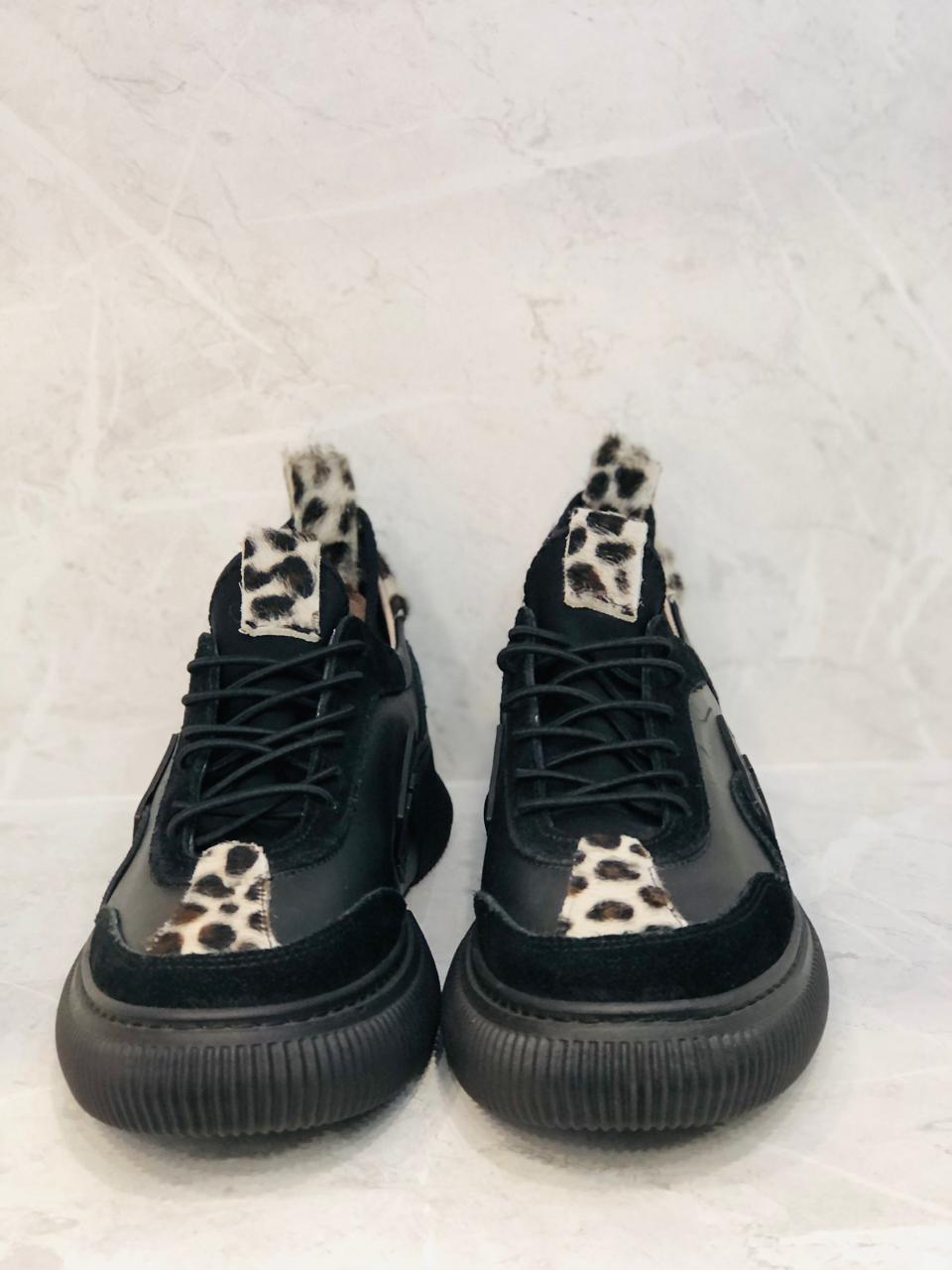 Black leather insole and lining sneakers with subtle leopard accents