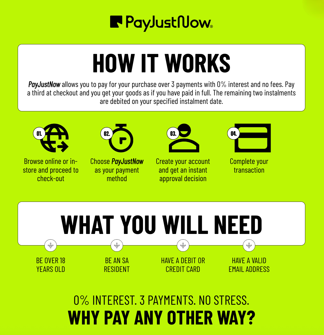 Pay over 3 EQUAL zero-interest instalments of R1,000.00 with PayJustNow.